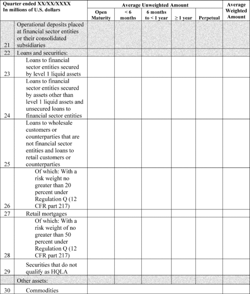 (x) The average weighted amount and, for each applicable maturity category, the average unweighted amount of secured lending transactions and unsecured wholesale lending to wholesale customers or counterparties that are not financial sector entities or consolidated subsidiaries thereof, and lending to retail customers and counterparties other than retail mortgages, described in §§ 249.106(a)(4)(iv), 249.106(a)(5)(ii), and 249.106(a)(6)(ii) (row 25);