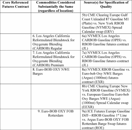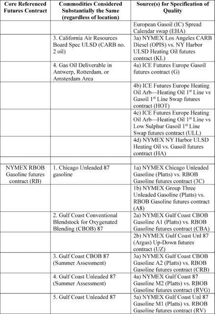 The following table lists each relevant core referenced futures contract and associated commodities that are treated as substantially the same as a commodity underlying a core referenced futures contract for purposes of the term “location basis contract” as such term is used in the referenced contract definition under § 150.1, and as such term is discussed in appendix C to this part.