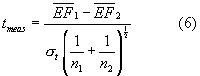 To determine if the enrichment factors measured in the quarterly tests are significantly different from the enrichment factors determined in the initial Step 2 tests, the t-test is used. In this test, the value tmeas: