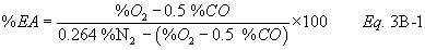 %EA = Percent excess air. 0.264 = Ratio of O2 to N2 in air, v/v.12.2 Percent Excess Air. Determine the percentage of the gas that is N2 by subtracting the sum of the percent CO2, percent CO, and percent O2 from 100 percent. Calculate the percent excess air (if applicable) by substituting the appropriate values of percent O2, CO, and N2 into Equation 3B-1.