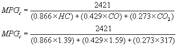 MPGc = (5174 × 10 4 × CWF × SG) / [((CWF × HC) + (0.429 × CO + (0.273 × CO2)) ((0.6 × SG × NHV) + 5471)]Example: