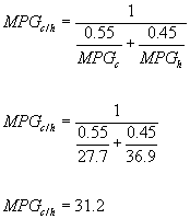 MPGc = (5174 × 10 4 × 0.868 × 0.745) / [(0.868 × .139 + 0.429 × 1.59 + 0.273 × 317)(0.6 × 0.745 × 18478 + 5471)] MPGc = 27.9(4) Assume that the same vehicle was tested by the Federal Highway Fuel Economy Test Procedure and a calculation similar to that shown in (b)(3) of this section resulted in a highway fuel economy of MPGh of 36.9. According to the procedure in § 600.210-08(c) or § 600.210-12(c), the combined fuel economy (called MPGcomb) for the vehicle may be calculated by substituting the city and highway fuel economy values into the following equation: